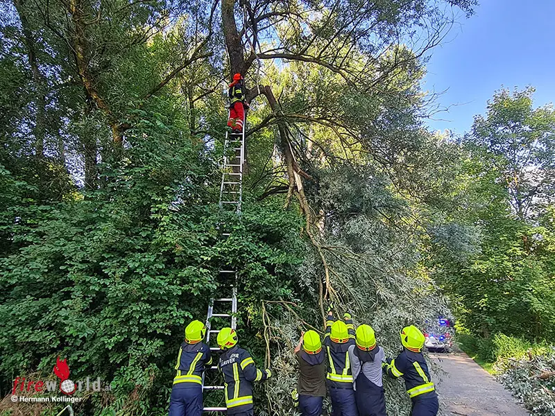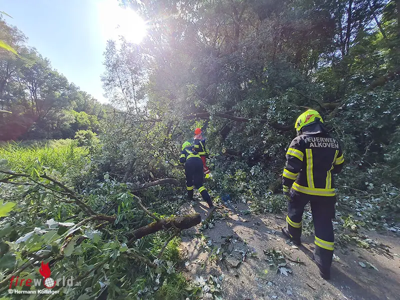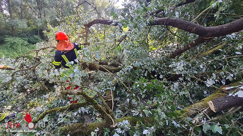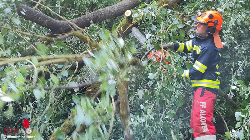 ALKOVEN (OÖ): Sechs Minuten nach einem Alarm für die Alkovener Tauchergruppe zu einer Person im Wasser im Pleschinger See in Steyregg (Bezirk Urfahr-Umgebung) wurde die Freiw. Feuerwehr Alkoven um 17.03 Uhr über die Landeswarnzentrale zu einer technischen Hilfeleistung in Gstocket alarmiert. Kurz nachdem eine Autolenkerin die Stelle nahe der Einfahrt zum Fkk-Gelände passiert hatte, brach ein größerer Baum aus heiterem Himmel ab und stürzte quer über die Fahrbahn.