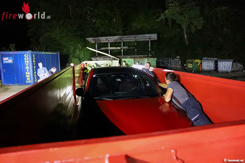 Das Auto wurde unter Begleitung der Feuerwehr auf einen Platz gebracht, wo es in einen speziell für brennende Elektrofahrzeuge konzipierten Container umgeladen werden konnte. Dort befindet sich der Pkw – der mit 53 Kilometern sozusagen fabriksneu ist – nun im Container zum Ausreagieren.
