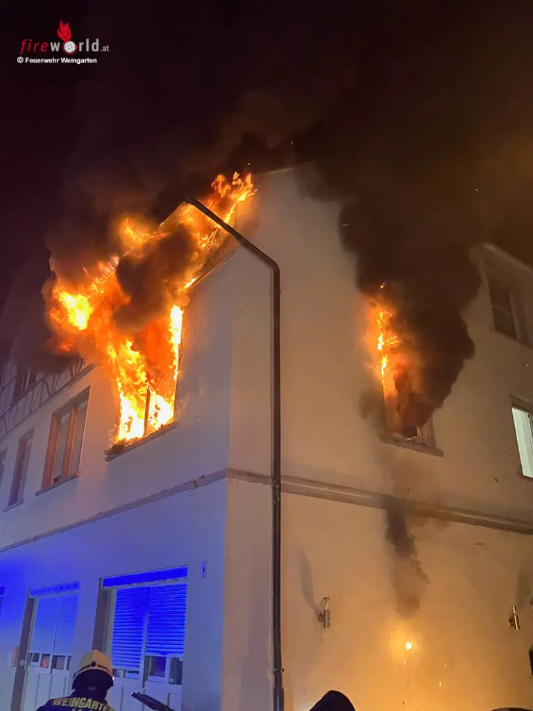 WEINGARTEN (DEUTSCHLAND): Um 01.35 Uhr des Donnerstag, 20. Juli 2023, wurde die Feuerwehr Weingarten zu einem Brand in einem Mehrfamilienhaus alarmiert. Bei Ankunft der Einsatzkräfte befand sich ein Zimmer im 1. Obergeschoss des Gebäudes in Vollbrand, aus den Fenstern schlugen bereits sichtbar die Flammen.