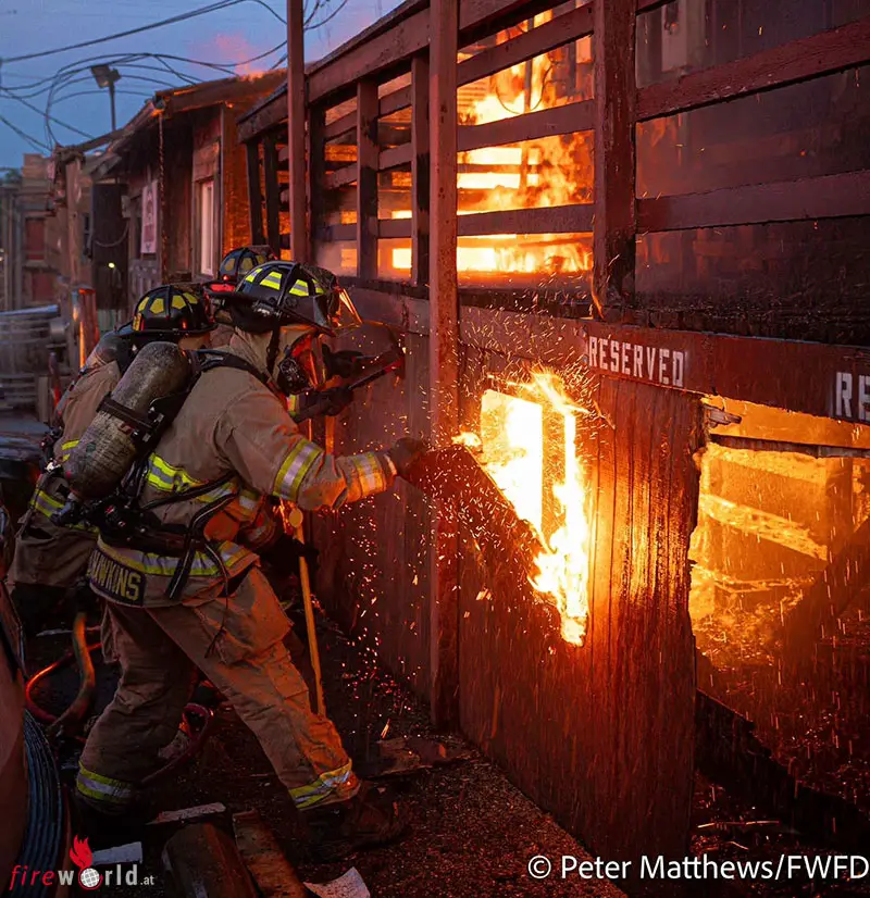 FORT WORTH (USA): Samstagabend, 5. August 2023, gegen 20:15 Uhr (Ortszeit) kehrte die Engine 2 der Feuerwehr von Fort Worth von einem Einsatz zurück und bemerkte ein bereits größeres Feuer, das die Rückseite der Cantina Cadillac Bar an der Exchange und Ellis verschlang.