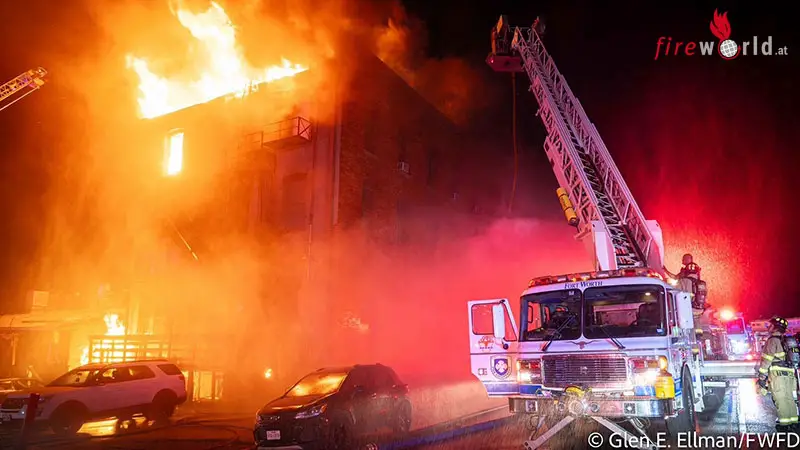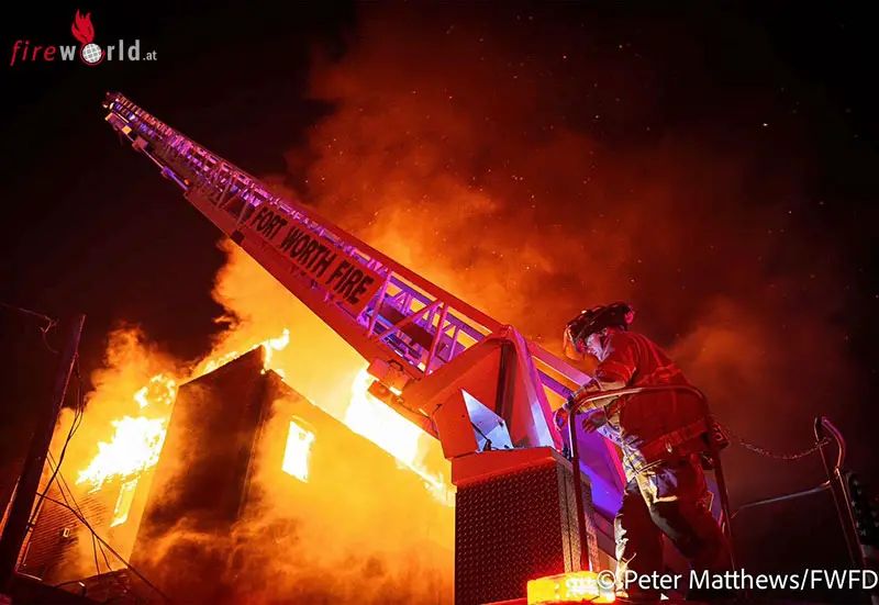 USA: 3. Alarm bei Großfeuer der historischen Cantina Cadillac Bar in Fort Worth → Feuerwehr entdeckt Brand, 7 Drehleitern eingesetzt