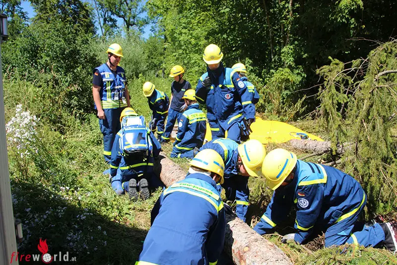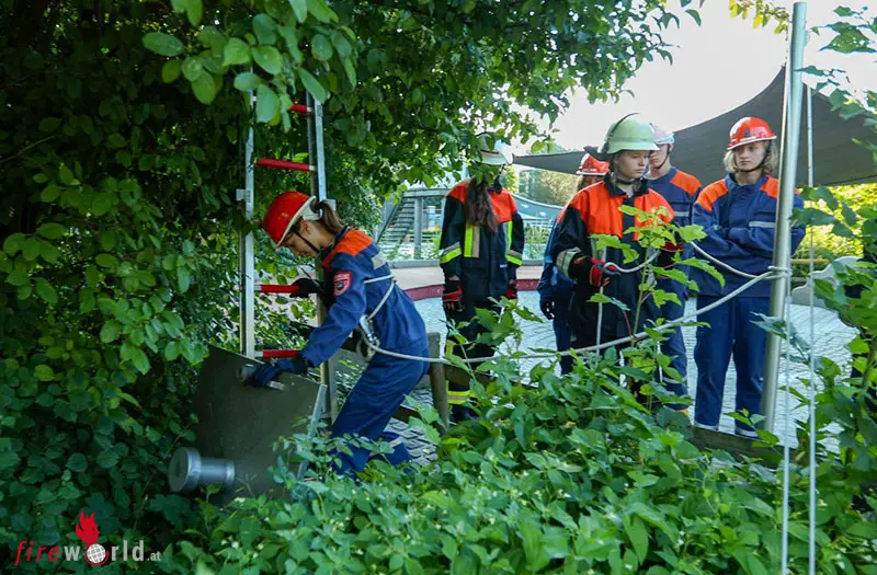 Von der „Katze auf dem Baum“ über „einen schweren Verkehrsunfall“ bis hin zu einer „ausgiebigen Wasserschlacht“ wartete auf die Jugendlichen ein ebenso interessantes wie abwechslungsreiches Programm. Am Freitagnachmittag trafen allesamt zur Begrüßung und zum „Bettbeziehen zusammen“, ehe zum ersten Mal die Alarmglocke ertönte. Eine Katze musste aus einem Baum gerettet werden – kein Problem für den Nachwuchs und den Einsatz einer Drehleiter. Als nächstes waren sie mit einem Mülltonnenbrand konfrontiert ehe sie zu einem Zimmerbrand gerufen wurden und ihr gesamtes Feuerwehr- und Erste–Hilfe-Wissen an den Tag legen mussten.