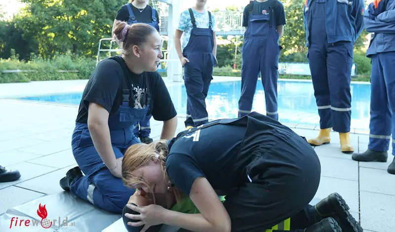 Das Schwimmbad wurde anschließend noch gleich mit einer Unterrichtseinheit verbunden. Mitglieder der Wasserwacht zeigten den Nachwuchslöschmeistern, wie man Personen aus dem Wasser retten kann, die kurz vor dem Ertrinken sind. Außerdem durften die Jugendlichen, das zu diesem Zeitpunkt noch menschenleere Schwimmbecken, für einen Sprung ins kühle Nass nutzen.