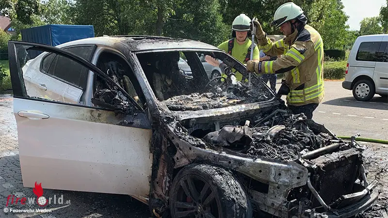 VREDEN (DEUTSCHLAND): Am 10. August 2023 um 11:19 Uhr wurde eine Gruppe des Löschzuges Vreden mit dem Stichwort „Fahrzeugbrand“ auf einen Parkplatz an der Straße „An´t Lindeken“ gerufen. Bei Eintreffen stand ein Fahrzeug im vorderen Bereich in Vollbrand. Das Feuer hatte bereits auf einen weiteren Pkw übergegriffen und zwei weitere beschädigt.