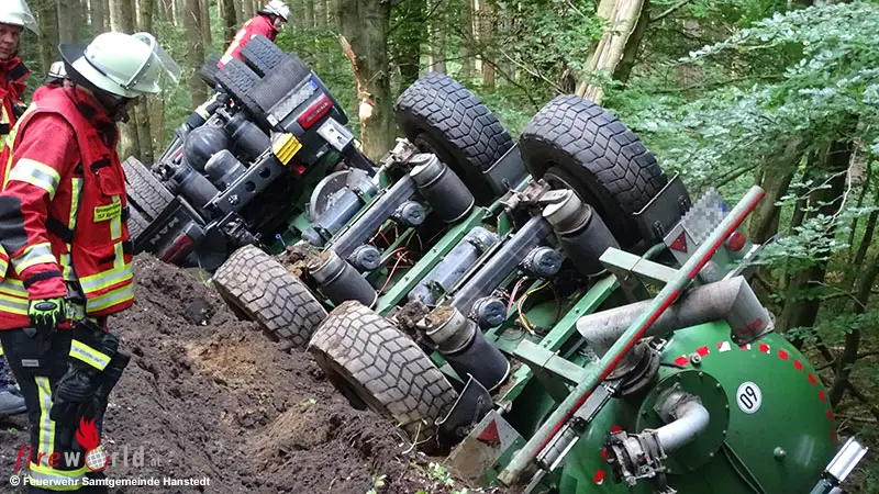 GARLSTORF (DEUTSCHLAND): Am Montagvormittag, dem 14. August 2023, gegen 09:45 Uhr war ein mit etwa 20.000 Liter Gülle beladener Sattelzug auf der Landstraße 212 zwischen den Ortschaften Garlstorf und Egestorf aus bisher unbekannter Ursache in die aufgeweichte Bankette der Fahrbahn geraten. Infolge stürzte das 40-Tonnen schwere Fahrzeug einen etwa 2 Meter tiefe Abhang hinab und kam an Bäumen auf der Seite liegend zum Stillstand.