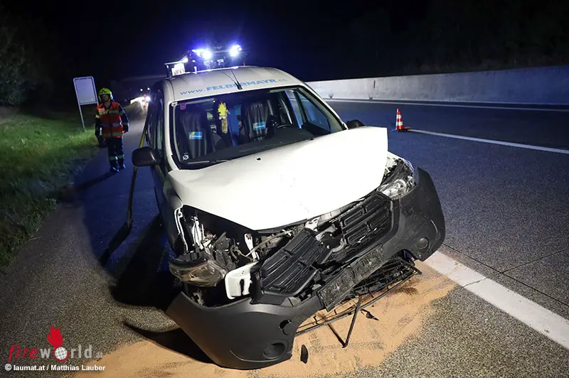Der Kleintransporter konnte den Wagen noch auf den Pannenstreifen steuern und dort anhalten. Entgegen der ersten Befürchtungen war niemand im Fahrzeug eingeklemmt. Die Feuerwehr führte in erster Linie Aufräumarbeiten durch und reinigte die Fahrbahn.