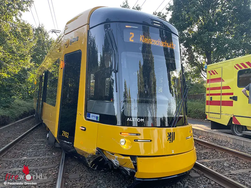 DRESDEN (DEUTSCHLAND): Die Spezialisten für Straßenbahnhilfeleistung der Feuer- und Rettungswache Albertstadt waren am 23. August 2023 bei einem Verkehrsunfall im Einsatz. Aus noch zu ermittelnder Ursache war es zu einem Verkehrsunfall zwischen einem Stadtbahnwagen der neuesten Generation der Dresdner Verkehrsbetriebe sowie einem Pkw gekommen.