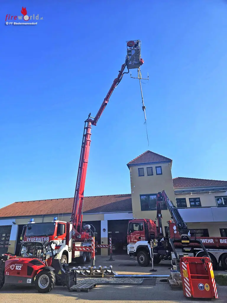 Am 22. August 2023 erfolgten nun die Montagearbeiten der Sirene auf dem Dach des Feuerwehrhauses, die durch die Teleskopmastbühne der Freiwilligen Feuerwehr Mödling unterstützt wurden.