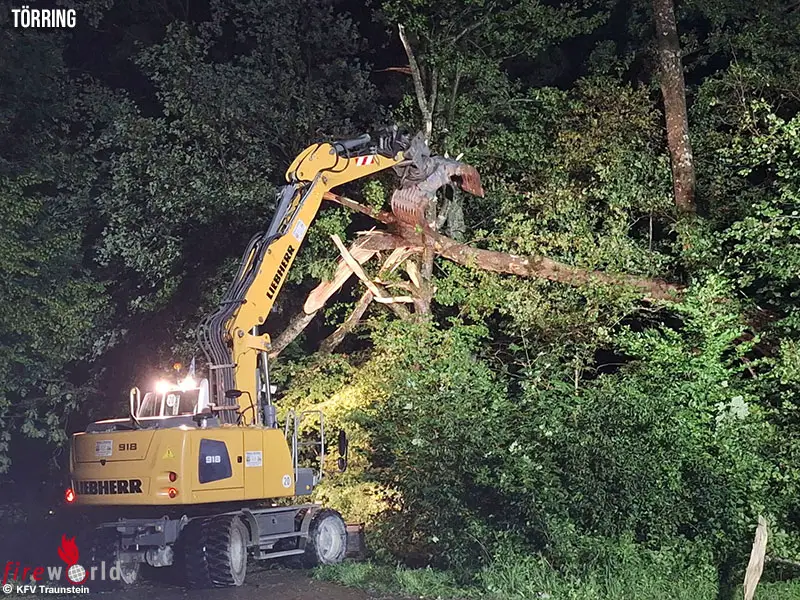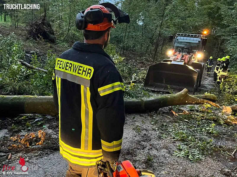 Auch die Große Kreisstadt wurde nicht verschont. Während sich die Haslacher Wehr um einen unter Wasser stehenden Lebensmittelmarkt kümmerte und diesen weitestgehend „trockenlegte“ musste die Feuerwehr Traunstein 20 Einsätze abarbeiten und dabei das gesamte Spektrum, von Bäumen auf Garagen, Wegen und Autos, ausgelösten Rauchmeldern und der Sicherung von Baustellen, bewältigen. Auch Surberg traf es mit einem schweren Windbruch und dem Freiräumen von Straßen. Durch die Nähe zum Chiemsee waren auch die Wehren am Ostufer stark gefordert. Die Freiwilligen der Wehren Chieming und Hart sowie die Feuerwehr Nußdorf hatten zusammen 18 Einsatzaufträge abzuarbeiten. Am meisten gefragt war schweres Gerät sowie Motorsägen zur Beseitigung umgestürzter Bäume.