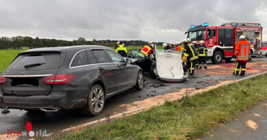 OLSBERG (DEUTSCHLAND): Zu einem Verkehrsunfall wurden die Löschgruppen Assinghausen, Brunskappel, Wulmeringhausen und der Löschzug Bigge – Olsberg in der Nacht zu Montag, dem 5. September 2023, alarmiert. Auf der B480 zwischen Steinhelle und Assinghausen war ein BMW aus ungeklärter Ursache nach links von der Fahrbahn abgekommen.