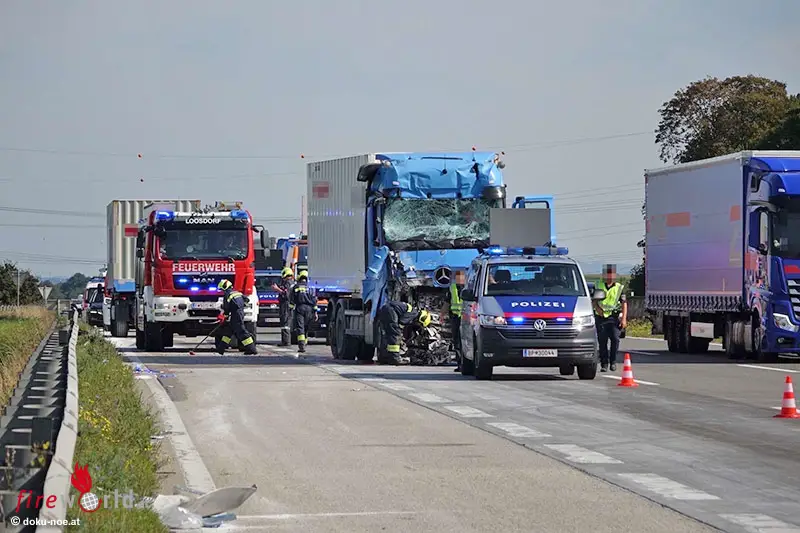 LOOSDORF (NÖ): Am Montag, den 18.September 2023, ereignete sich auf der A1 Westautobahn Fahrtrichtung Salzburg kurz nach der Auffahrt Loosdorf ein schwerer Lkw-Unfall. Aus unbekannten Grund fuhr ein Lenker eines Sattelschleppers auf einen Lkw mit Siloanhänger auf.