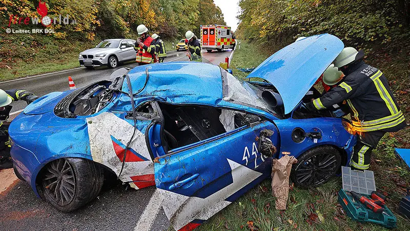 BAD REICHENHALL/MARZOLL (BAYERN): Feuerwehr, Rotes Kreuz und Polizei mussten am Donnerstagvormittag, dem 26. Oktober 2023, auf die B21 ausrücken, wo auf Höhe von Weißbach-Marzoll ein mit zwei älteren Leuten besetzter Renault-Alpine Sportwagen aus Tirol in Richtung Salzburg kurz nach der Ampel an der Einmündung der Tumpenstraße alleinbeteiligt nach rechts von der regennassen Fahrbahn abgekommen und mit der Beifahrerseite und den Dach gegen einen massiven Baum geschleudert war.