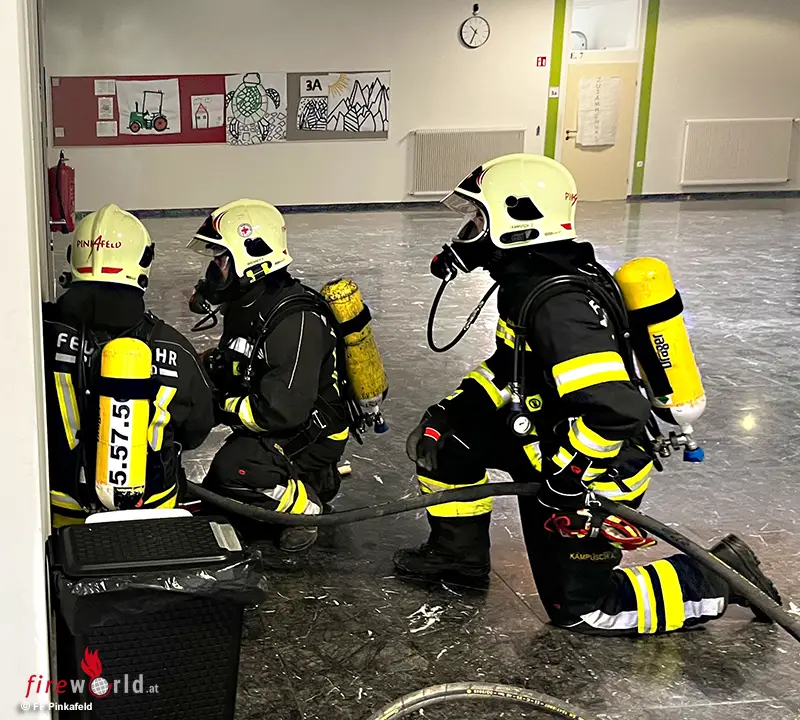 Ein Lehrer meldete dem Einsatzleiter der Feuerwehr Pinkafeld, dass alle Kinder und auch das Lehrpersonal im Freien und somit Sicherheit sind. Die weitere Einweisung erfolgte durch den Schulwart. Es handelte sich um einen Brand in einer Toilettenanlage im Erdgeschoß. Sofort wurde ein Atemschutztrupp mit einem HD- Rohr zur Brandbekämpfung ins Gebäude geschickt.
