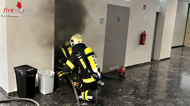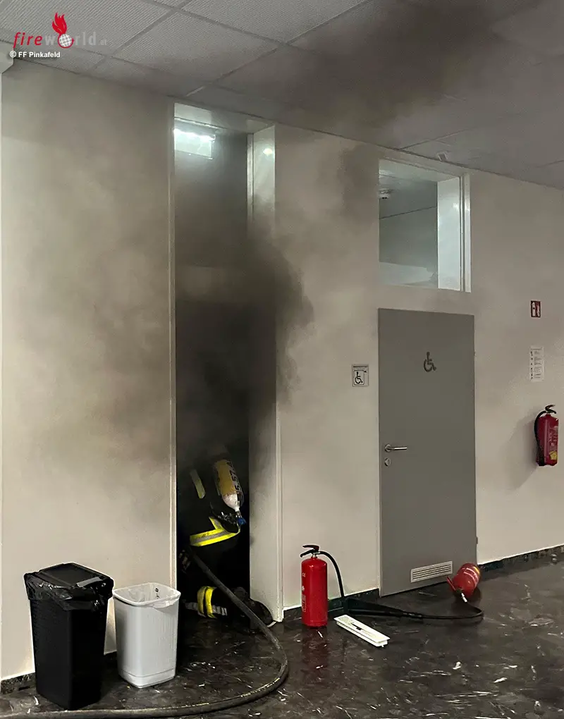 Beim Öffnen der Tür zum Brandraum strömte dichter schwarzer Brandrauch in die Aula der NMS. Parallel zum Löschangriff wurde eine zweite Löschleitung vor dem Eingang aufgebaut. Bereits nach wenigen Minuten konnte durch den ATS- Trupp „BRAND AUS“ gegeben werden. Der Brandherd war ein Papierspender in einer Toilette. Nach den Löscharbeiten wurde das Gebäude mittels Druckbelüfter durchgelüftet.