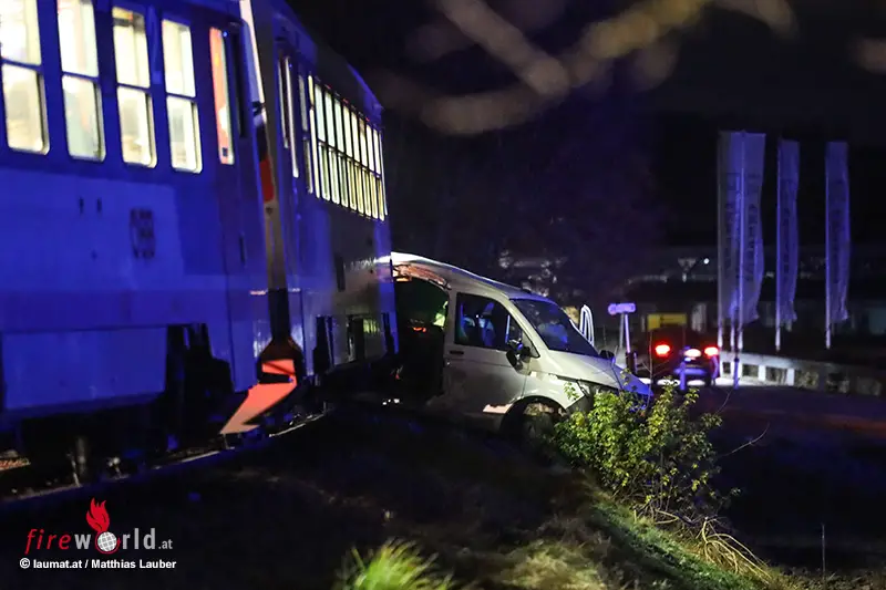 Ein Regionalzug der Salzkammergut- beziehungsweise Hausruckbahn hat an einer Eisenbahnkreuzung einen Kleintransporter erfasst und etwa 70 Meter weit mitgeschleift.