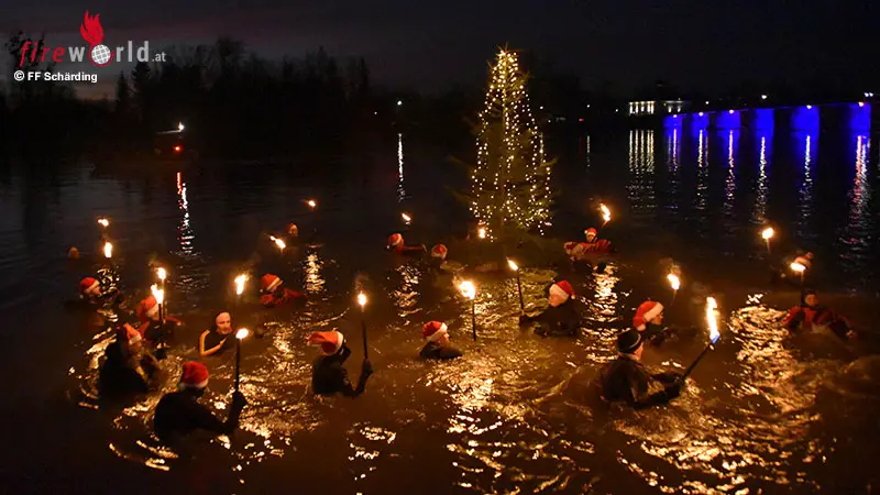 22 Taucher der Feuerwehren Schärding und Ried, sowie der Wasserrettung Schärding schwammen mit Fackeln und einem beleuchteten Christbaum von der Innlände im Bereich des Gesundheitshotels Gugerbauer bis zum Wassertor entlang. Keine leichte und vor allem körperlich fordernde Aufgabe, wenn man bedenkt, dass die Wassertemperatur bei nur 6,8 ° Celsius lag.