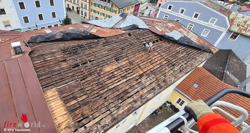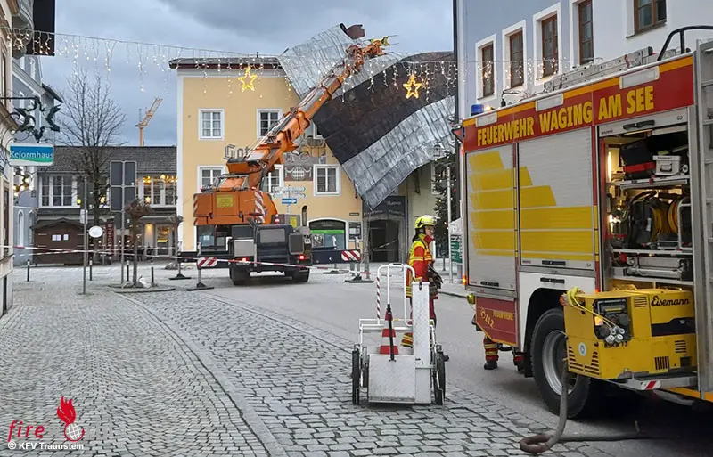 In Waging waren die Floriansjünger am 23.12. wegen umgestürzter Bäume auf der Ottinger Straße sowie am Plosauer Berg mit Unterstützung des gemeindlichen Bauhofes gefordert. In den Nachmittagsstunden galt es am Marktplatz ein Gebäude zu sichern. Der starke Wind hatte ein etwa 350 Quadratmeter großes Blechdach teilweise herunter geweht, das teilweise über die Fassade herunterhing. Die Feuerwehr ergriff umfangreiche Absicherungsmaßnahmen und forderte einen mobilen Kran nach, der die Gefahr in den Abendstunden beseitigen konnte. Außerdem wurde das Dach notdürftig wieder verschlossen. Für die Arbeiten „in luftiger Höhe“ kam die Drehleiter zur Sicherung der Feuerwehrleute aus Waging und Nirnharting zum Einsatz. Rund 40 Einsatzkräfte waren bis in die Abendstunden im Einsatz.