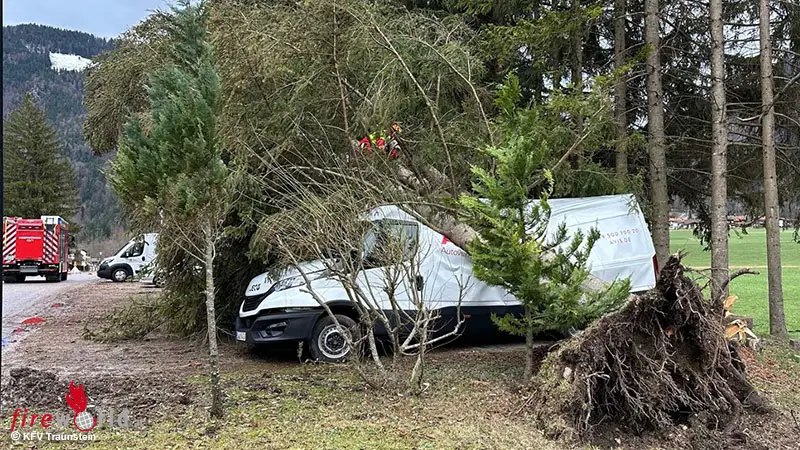 Baum fällt auf Kleintransporter in Oberwössen – Brandalarm am Heiligen Abend in Kössen