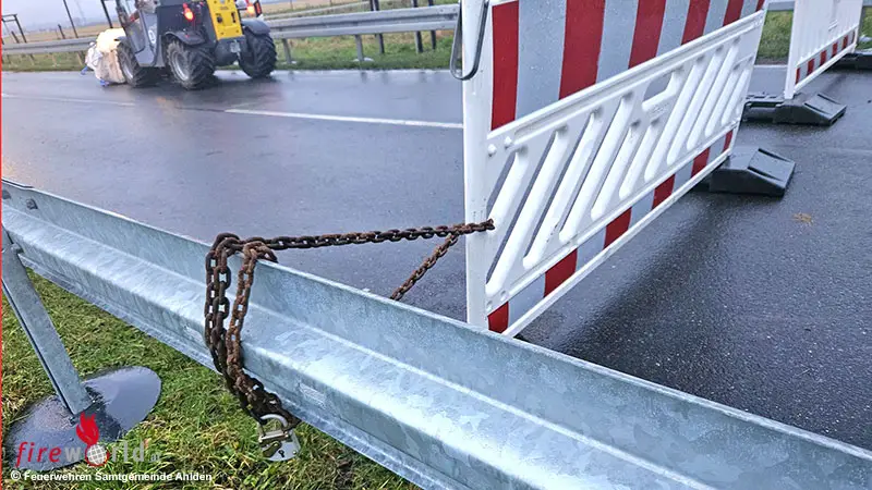 Die Herausforderung bestand nun eher darin, den Fahrzeugverkehr trotz gesperrter Straßen von einer unberechtigten Durchfahrt abzuhalten. Auch wenn seitens Feuerwehr und auch Verwaltung Verständnis für die umständlichen Umwege besteht (viele sind selbst betroffen), so besteht absolutes Unverständnis über die häufige Missachtung der Straßensperren. Die L191 schützt in diesem Bereich ein Ahldener Wohngebiet wie ein Damm. Eine Belastung des aufgeweichten Damms durch überfahrende Fahrzeuge könnte zu einem Szenario führen, das wir uns nicht ausdenken mögen, aber planen müssen bei allen Entscheidungen nicht außer Acht lassen dürfen. Bei einem Durchbruch wären nicht nur Teile Ahldens, sondern auch Eilte und weiter Frankenfeld, Bosse bis Rethem betroffen. Die gesperrte Straße ist mittlerweile mit Barrieren versehen.