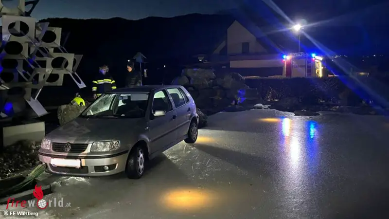 WARTBERG (STMK): Zu einem kuriosen Einsatz wurde die Feuerwehr Wartberg am Montag, den 15. Jänner 2024, alarmiert. Ein Fahrzeuglenker kam beim Einparken aufgrund eines Fahrfehlers auf das Nachbargrundstück und blieb genau am Teich stehen.