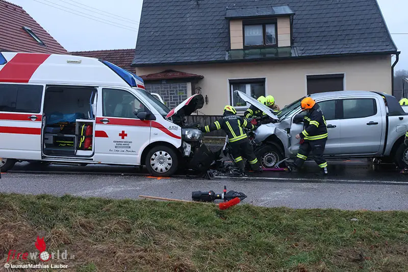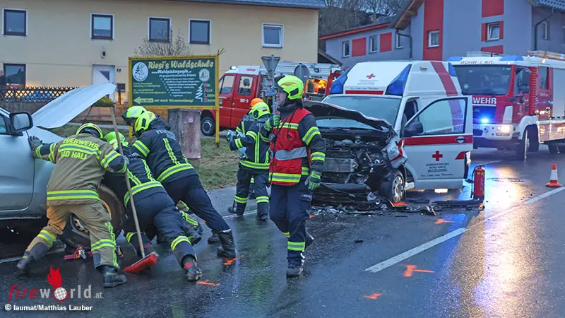 Oö: Frontalkollision zwischen Rettungsfahrzeug und Pickup → drei Verletzte auf der B 122
