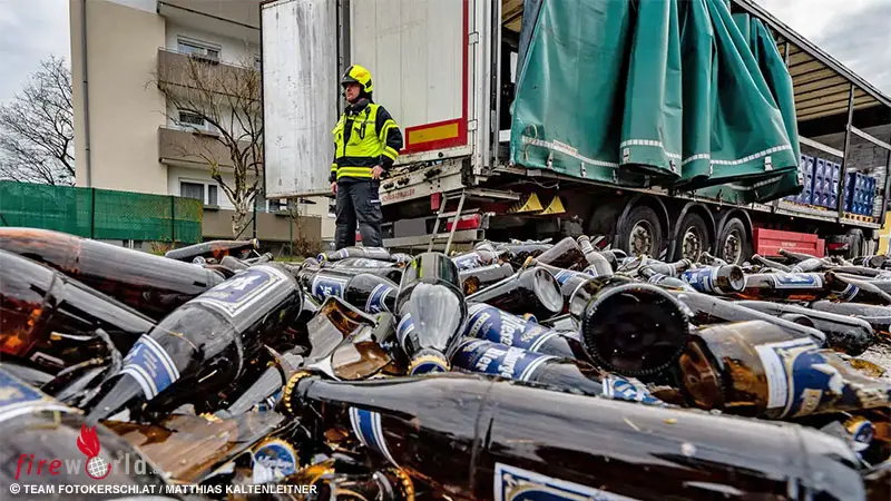 SEEWALCHEN (OÖ): In Seewalchen hat am 15. Februar 2024 ein Sattelschlepper in einer Kurve Ladung verloren. Durch die ausgedehnte Verschmutzung der Fahrbahn und den enormen Glasbruch wurde die Straße für die Dauer von 2,5 Stunden gesperrt.