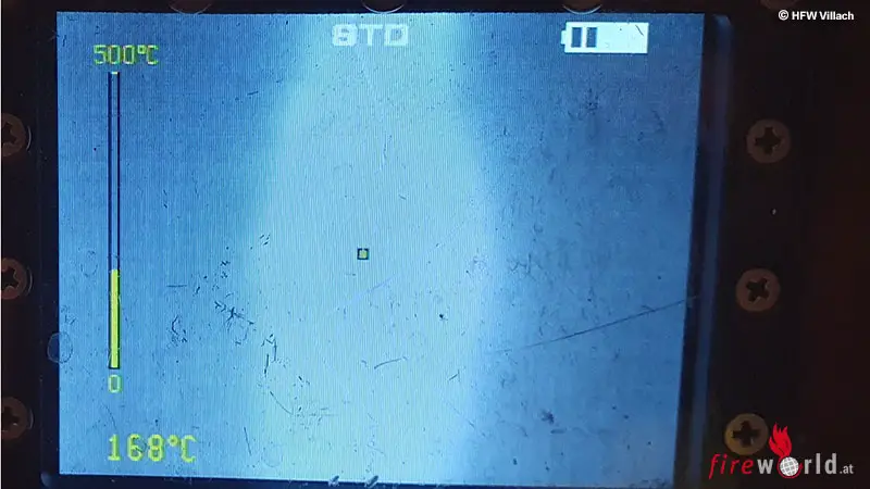 Durch die ersten Kräfte wurde der zuständige Rauchfangkehrer hinzugezogen. Dieser begann der Ursache auf den Grund zu gehen. „Nachdem erste Löschversuche und die Kehrversuche im Kamin mittels Pulverlöschern nur geringe Wirkung zeigten und im dritten Stock in der Wand mittels Wärmebildkamera ein Bereich mit über 160 Grad Celsius gemessen werden konnte, wurde gemeinsam mit dem Rauchfangkehrer entschieden, die Wand in der betroffenen Wohnung mittels schweren Gerät zu öffnen, um eine weitere Ausbreitung zu verhindern“, berichtet Einsatzleiter Oberbrandmeister Scharf Alexander, Zugskommandant der Hauptfeuerwache Villach. Es wurden zusätzlich weitere Kräfte der Hauptfeuerwache alarmiert. Mittels Drehleiter wurden der Dachbereich und der Kamin von außen kontrolliert.