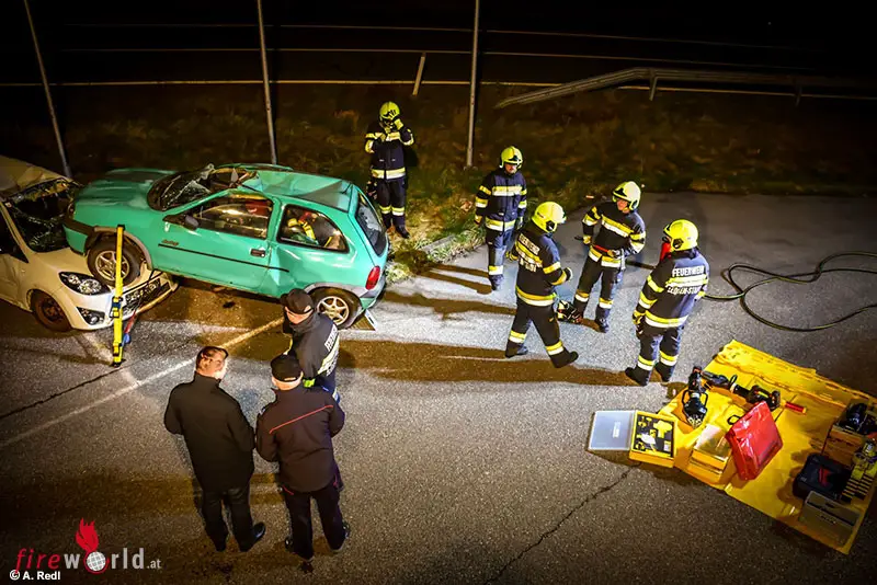 Das Übungsszenario war ein Verkehrsunfall mit zwei Pkw, wobei eine Person eingeklemmt war. Ein doppelter Brandschutz wurde aufgebaut und die Fahrzeuge gesichert. Eine hintere Seitenscheibe wurde entfernt und ein Feuerwehrsanitäter kletterte in den havarierten Pkw zum eingeklemmten Fahrer, um ihn zu beruhigen und mit einem hydraulischen Stempel das Dach anzuheben.