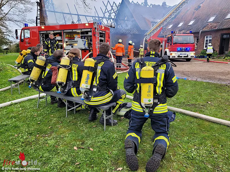 Auch die SEG Rettung Rotenburg wurde zur Absicherung der Kräfte hinzugerufen. Diese ist während der Löscharbeiten auch benötigt worden, da zwei Feuerwehrmänner mit Verdacht auf Rauchgasvergiftung behandelt werden mussten. Durch das verwinkelte Gebäude gestalteten sich die Löschmaßnahmen als schwierig. Auch genügend Löschwasser für die zwei Drehleitern und weitere Löschangriffe zu erhalten, stellte anfangs eine Herausforderung dar.