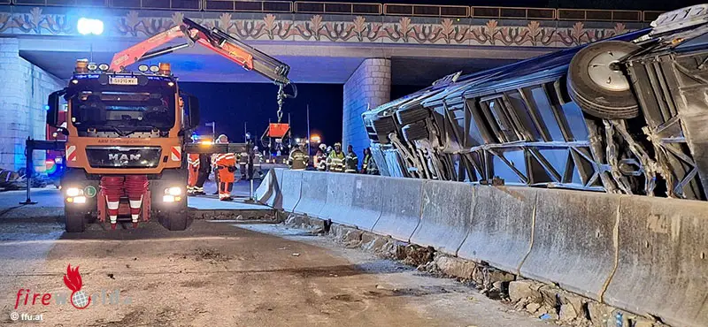 Nach der Autobahnbrücke fuhr der Lenker auf die Schräge der Betonleitschiene und der Bus stürzte seitlich um. Beim Eintreffen der Einsatzkräfte waren noch 7 Personen im Reisebus, einige davon eingeklemmt.
