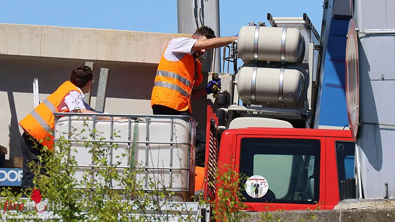 Die Feuerwehr stand im Einsatz um eine größere Menge ausgelaufener Betriebsmittel zu binden. Mit einem Schwerkran wurde die Ladung wieder entsprechend platziert.