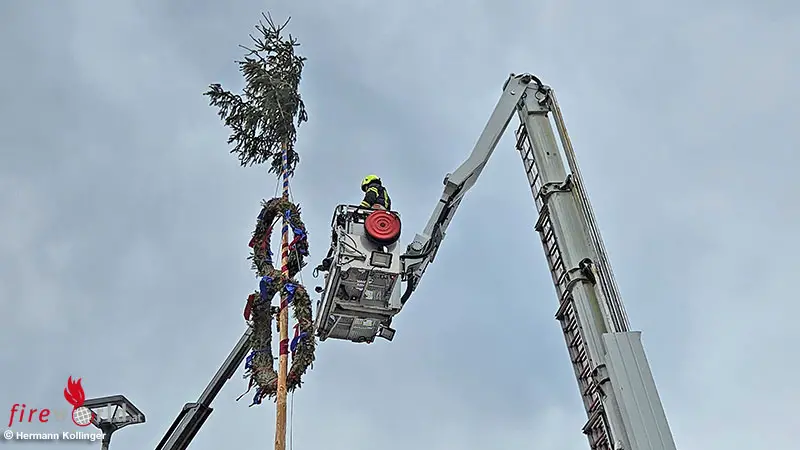 Vor Ort wurde bei den immer wieder einsetzenden Windböen ein starkes Pendeln der Maibaumringe festgestellt, wobei nicht sichergestellt werden konnte, dass bei Verstärkung des Windes auch das Gewächs selbst dem Druck standhalten würde. So erfolgte die Absprache mit der Besitzering und der Entschluss, das Gewächs gleich als Gesamtes zu entfernen. Per Korbpersonal aus der in Stellung gebrachten Teleskopmastbühne wurden entsprechende Schlaufen angebracht und am Kranhaken des Kranfahrzeugs fixiert.