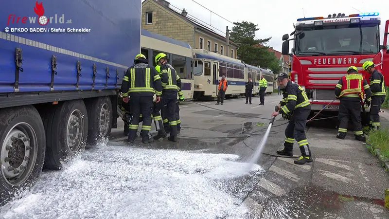 Nö: Hoppala beim Abbiegen → Lkw-Sattelzug touchiert Badener Bahn, Auflieger verkeilt sich → Schaum als Gleitmittel