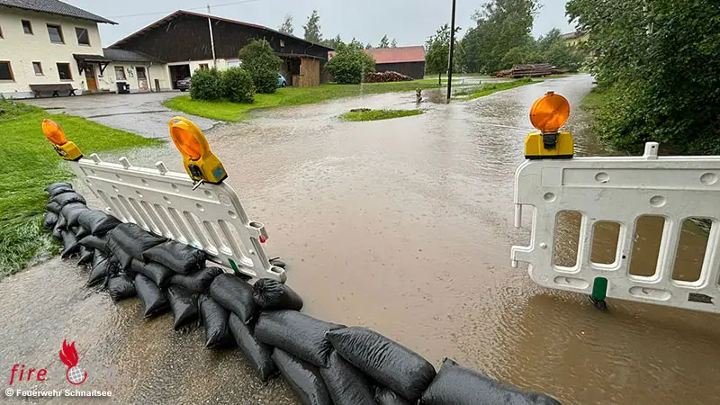 Der erste Einsatz des Samstags war in Pittenhart. Gegen 8 Uhr wurde die Feuerwehr nach Aindorf alarmiert. In ein Gebäude kam es zu einem Wassereintritt durch einen überlaufenden Bach. Daraufhin wurden Sandsäcke aufgeschichtet und eine Pumpe in Betrieb genommen, um das Wohnhaus zu schützen. Fast zeitgleich wurde die Feuerwehr Schnaitsee wegen eines umgestürzten Baumes zwischen Eggerding und Schablinghof alarmiert. Nur eine Stunde später musste die Feuerwehr Schnaitsee erneut ausrücken. „Wasser im Keller“ lautete die Alarmmeldung im Ortsteil Stangern.
