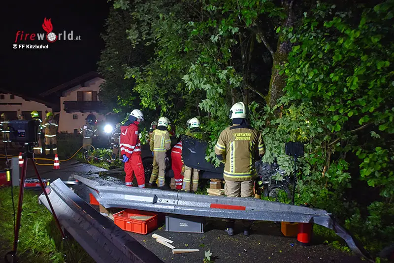 Am 02.06.2024 gegen 02:25 Uhr lenkte ein 25-jähriger deutscher Staatsangehöriger seinen PKW, in dem er noch 3 Personen (männlich, 25-j., 21-j., 23-j., alle deutsche Staatsangehörige) mitführte, auf der B161, Kitzbüheler Straße, von Aurach kommend in Richtung Jochberg. Vermutlich aufgrund überhöhter Geschwindigkeit kam er bei km 20,49 in einer Rechtskurve von der Fahrbahn ab und prallte frontal gegen die dortige Leitschiene und in weiterer Folge gegen einen Baum. Der Lenker wurde am Fahrersitz eingeklemmt und musste durch die Feuerwehren Kitzbühel und Jochberg mit hydraulischem Rettungsgerät befreit werden.