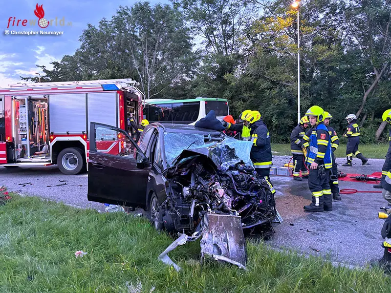 Nö: Pkw prallt auf LB 17 bei Günselsdorf gegen Linienbus → Feuerwehr befreit eingeklemmte Lenkerin