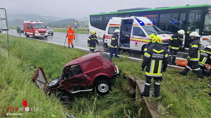 Dabei wurde ein Pkw in den Straßengraben geschleudert und in sein Fahrzeug eingeklemmt. Die alarmierten Feuerwehren mussten den Lenker mit hydraulischen Rettungsmittel aus dem Fahrzeug befreien.