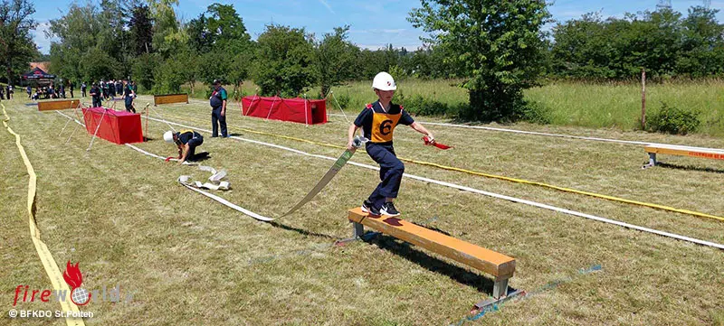 Für die 10- und 11 jährigen Mitglieder der Feuerwehrjugend wird ein dem Alter entsprechend adaptierter Bewerbabgehalten. Beim Feuerwehrjugendbewerbsabzeichen, das als Einzelbewerb abgehalten wird, muss ein Schlauch verlegt, eine Hürde sowie eine Laufbank überwunden und anschließend auf einem Gestell FeuerwehrtechnischeGeräte aufgeklebten Bildern zugeordnet werden. Stolz auf die Leistungen der jüngsten Feuerwehrmitglieder konnte das Bezirksfeuerwehrkommando die Besten imRahmen der Siegerverkündung zu ihren Leistungen gratulieren. Jugendgerecht dauerte die Siegerverkündung, wie immer im Bezirk St.Pölten, nur wenige Minuten.