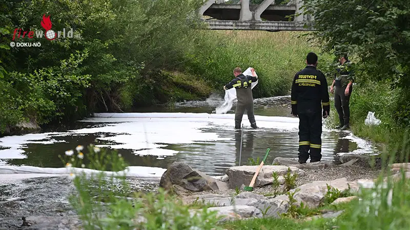 Doch es sollte nicht nur der Unfall sein, den dieser war mit ca. 600 Liter Heizöl in einem Container beladen und floss aus. Die Feuerwehr Kasten errichtete sofort beim angrenzenden Bach mehrere Sperren und forderte den Schadstoffzug der FF St. Pölten Stadt nach.