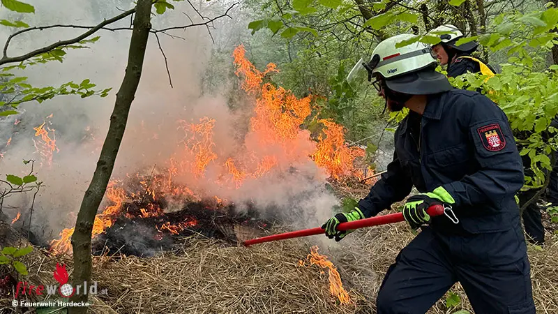 Ein Waldbrand, simuliert mit brennendem Stroh, wurde mit Feuerpatschen und Löschrucksäcken sowie im zweiten Teil mit einer Pumpe und D-Strahlrohren vom geländegängigen Mehrzweckfahrzeug erfolgreich und effektiv bekämpft. Auch das neue geländegängige Tanklöschfahrzeug, ein Unimog, war im Einsatz. Der erfahrene Dozent bescheinigte der Feuerwehr Herdecke eine gute Ausstattung.