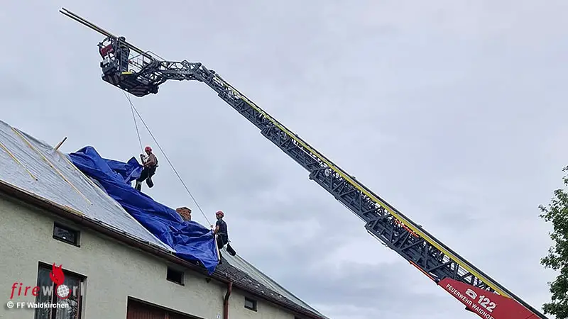Durch die Sturmböen und die Gewitter in der Nacht auf Sonntag wurden einige wenige Planen von den Dächern losgerissen bzw. beschädigt, dadurch drang Regenwasser in die Wohnhäuser ein. Die Planen mussten erneut gesichert werden. Die Feuerwehr Waidhofen/Thaya unterstützt mit der Drehleiter und fünf Mitgliedern die örtlichen Kräfte der Feuerwehr Waldkirchen.