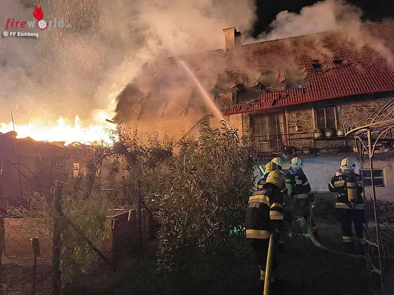 Beim Eintreffen der Einsatzkräfte stand das Stallgebäude bereits in Vollbrand, wobei die Flammen auf das angrenzende Wohnhaus übergreifen zu drohten.