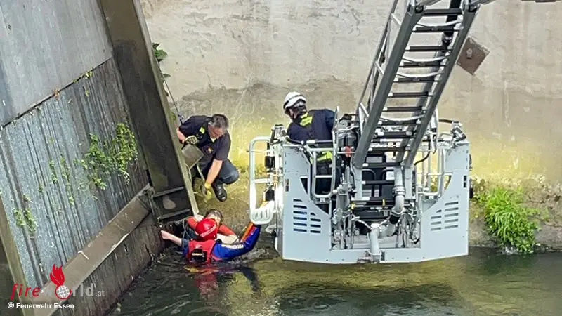 D: Hilflose Person treibt in Essen im Wasser → Frau per Unterflur-Drehleiter-Einsatz aus der Ruhr gerettet