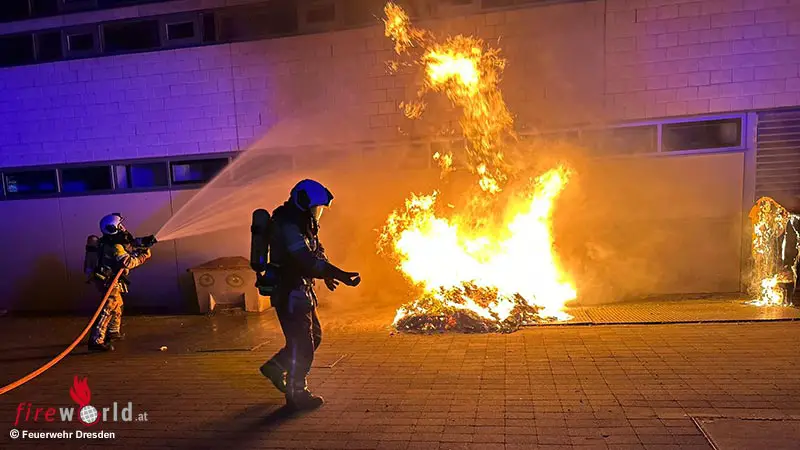 DRESDEN (DEUTSCHLAND): Die Feuerwehr Dresden wurde innerhalb weniger Minuten zu einer Serie von Bränden an Müllcontainern alarmiert. Die Brandserie begann gegen 18:45 Uhr des 28. September 2024, als auf dem Zelleschen Weg mehrere Müllcontainer in einer Feuerwehrzufahrt in Flammen standen.
