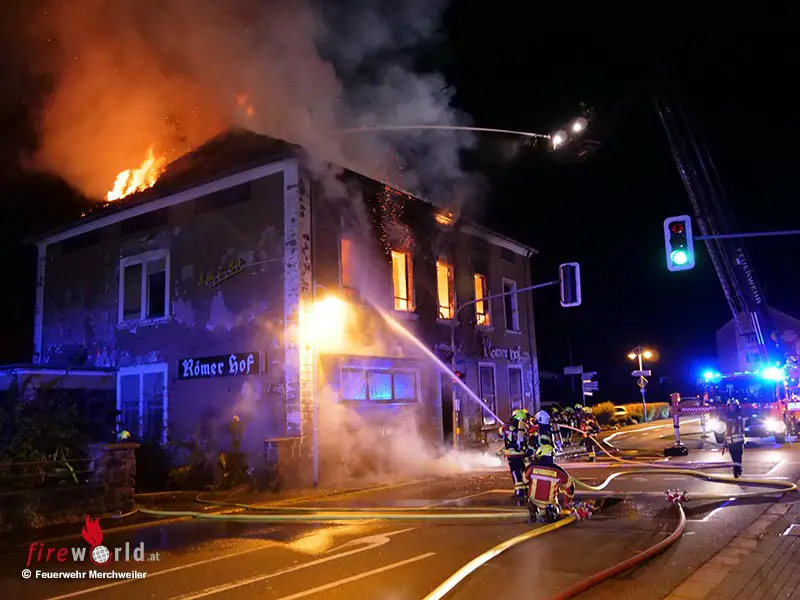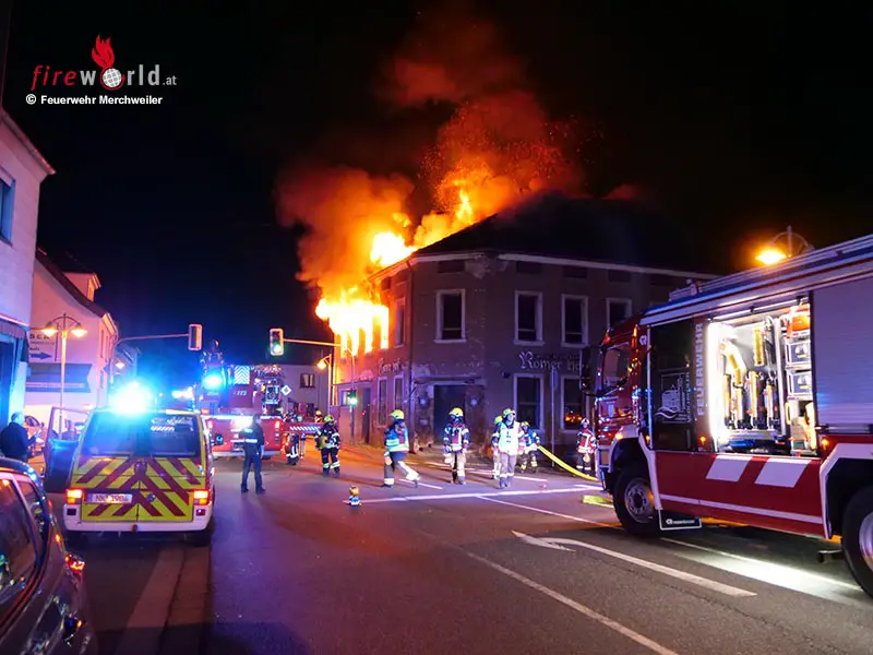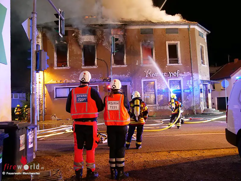 MERCHWEILER (DEUTSCHLAND): In der Nacht auf den 5. Oktober 2024 wurde die Feuerwehr Merchweiler um 00:45 Uhr zu einem Großbrand in einem leerstehenden Hotel-Restaurant in der Hauptstraße alarmiert. Wegen der gemeldeten Lage wurde von der integrierten Leitstelle auf dem Winterberg zusätzlich die Drehleiter der Feuerwehr Illingen angefordert.