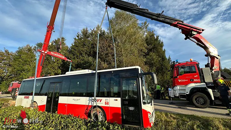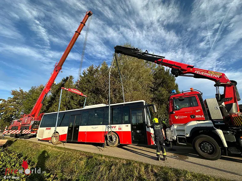 Der Alarm ging um 15:42 Uhr ein, und nach der ersten Einschätzung der Freiwilligen Feuerwehr Schiedlberg wurde schnell klar, dass spezialisierte Ausrüstung erforderlich war, um das Fahrzeug sicher zu bergen. Daraufhin wurde der Technische Zug der Feuerwehr Steyr nachalarmiert, der mit einem Kran anrückte, um den Bus wieder auf die Fahrbahn zu heben.