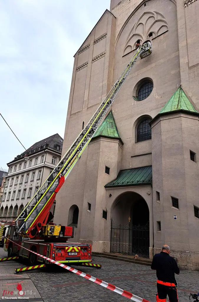 MÜNCHEN (BAYERN): Am Samstagnachmittag, 12. Oktober 2024, ist ein Mann von der Feuerwehr München vom „Alten Peter“ gerettet worden. Auch eine Drehleiter kam zum Einsatz.