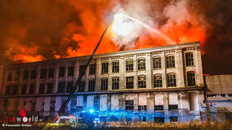 GRONAU (DEUTSCHLAND): Durch Feuer hell erleuchtet war der Himmel über dem Gebäude der ehemaligen Baumwollspinnerei Gronau an der Fabrikstraße in der Nacht auf den 19. Oktober 2024. Um 2:52 Uhr in der Nacht vom Freitag auf Samstag wurde die Feuerwehr Gronau mit dem Stichwort „Feuer aus Gebäude“ alarmiert. Bereits auf der Anfahrt war für die Einsatzkräfte der Feuerschein oben auf dem Dach des zurzeit ungenutzten Gebäudes zu sehen.
