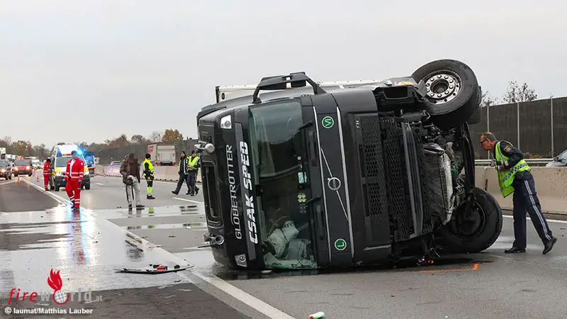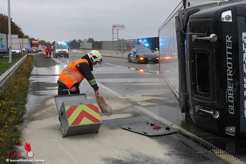 WELS (OÖ): Ein Lkw ist Montagnachmittag, 11. November 2024, bei einer Kollision mit einem Pkw auf der A25 Welser Autobahn in Wels-Puchberg ins Schleudern gekommen und dann umgestürzt.