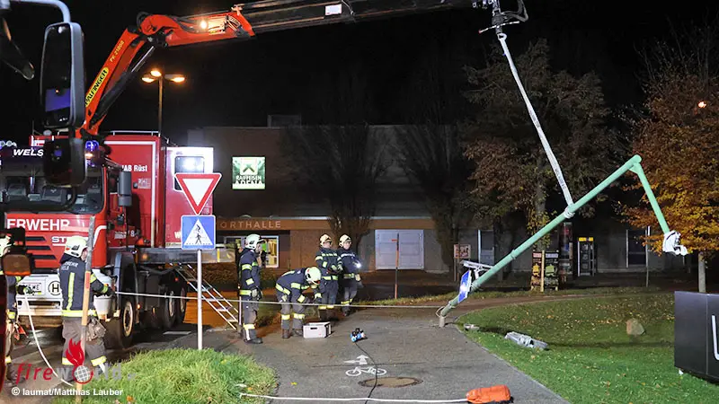 WELS (OÖ): Eine Straßenlaterne, die offenbar nach einem Verkehrsunfall stark beschädigt und in Schieflage war, beschäftigte in der Nacht auf Samstag, 23. November 2024, in Wels-Lichtenegg die Feuerwehr.